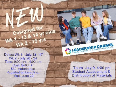 Empower teens with skills, confidence, and real-world, leadership challenges for a transformative experience. Dates: July 13-17, 2026 Time: 9:00 am- 4:00 pm Cost: $400.00 + $30.00 matirial fee Registraion Deadline: Mon. June 29, 2026