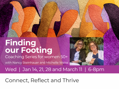 Join us for Finding Our Footing, a powerful and supportive small-group coaching experience designed for women in transition. Now is the time to embrace change, build genuine connections, and step confidently into your most vibrant chapter yet. This is your space to connect, reflect, and get clear on your future. Over three core sessions and a follow-up reunion, we'll dive deep into key areas of self-discovery and empowerment: Session 1. How Did I Get Here? What Do I Really Want? (January 14) Session 2. My Body’s Changing! Who’s that Stranger in the Mirror? (January 21) Session 3. What’s Next? Who do I want to become? (January 28) Reunion Session (March 11) Nancy Steinhauer is an ICF-Certified Coach and award-winning educational leader with an MA in Human Development and Applied Psychology. Nancy provides a space for deep connection, thinking, and growth, helping individuals and groups chart their next steps. Michelle Weiss is a Registered Social Worker who uses mindfulness and practical tools to help you reconnect with your goals, feel emboldened, and become unstoppable so you can truly love your life. Special Member Price $160What You'll Discover