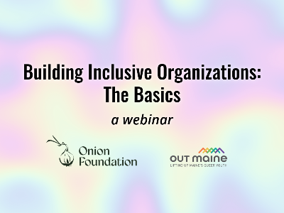 Feeling stuck on reaching diverse populations with your programs? Trying to get more folks from your team on board with updating policies? This webinar is for you! On April 23rd, OUT Maine and The Onion Foundation be hosting “Building Inclusive Organizations: The Basics,” a 101-level public webinar meant to introduce organizations and individuals to the fundamentals of running inclusive programs. We’ll be making the case for why such work is urgent and deeply needed in Maine. Sign up now for free! After registering, you will receive details on how to join sent via email the day before the event.