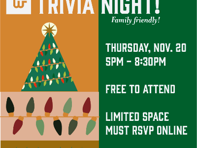 Join us for a fun Family-Friendly Holiday Trivia Night! Think you know your reindeer from your elves? Your carols from your cookies? Gather your friends and family for a night of festive fun at Holiday Trivia Night! Food and drinks available to purchase. We'll group teams into 3-5 people. If you'd like to request to be on a specific team with people, email us at programs@triwoodcommunity.com Free to attend, but must RSVP online due to room capacity! Dress up in your favorite holiday attire and lets make some memories together! Doors open at 5pm
