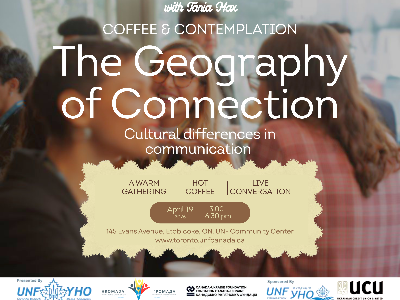 COFFEE & CONTEMPLATION with Tania Max A warm gathering • Hot coffee • Live conversation When: April 19, 2026, 3:00–5:30 PM Where: UNF Community Center, 145 Evans Avenue, Etobicoke, ON THE GEOGRAPHY OF CONNECTION Cultural Differences in Communication Organized as part of the Hromada Program | UNF of Canada - Toronto Branch КАВА ТА МІРКУВАННЯ with Tania Max Коли: 19 квітня 2026, 15:00-17:00 ГЕОГРАФІЯ КОНТАКТУ Весняна зустріч про культурні відмінності у спілкуванні Організовано в рамках програми "Громада" | УНО Канади - Філія Торонто