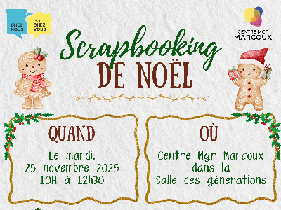Venez participer à notre atelier de scrapbooking pour créer de magnifiques cartes de Noël ! Quand : Mardi 25 novembre, de 10h00 à 12h30 Tout le matériel sera fourni : papiers, décorations, enveloppes, etc. Chaque participant pourra conserver deux cartes à offrir à ses proches. En plus, 36 cartes supplémentaires seront réalisées pour être offertes le 24 décembre à des aînés isolés lors de la distribution alimentaire de la popote roulante du Patro Roc-Amadour. đź’Ś Des rafraîchissements, café et petites collations vous attendent pour rendre ce moment encore plus convivial.Atelier de scrapbooking : Cartes de Noël 🎄
