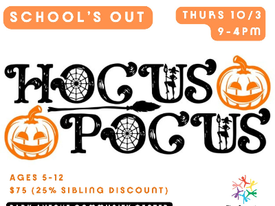 Get ready for a magical journey through the world of mystery and fun in our day-long camp themed "Hocus Pocus" ! Join us for a day filled with spooktacular activities to get into the Halloween mood, including: Schedule: The day's activities are laid out similar to our typical camp day. Send lunch and two snacks along with a refillable water bottle. This program is led by our professional teaching artists and supported by vetted teen assistants (15 yrs or older) and volunteer CITs (13 & 14 yrs old).